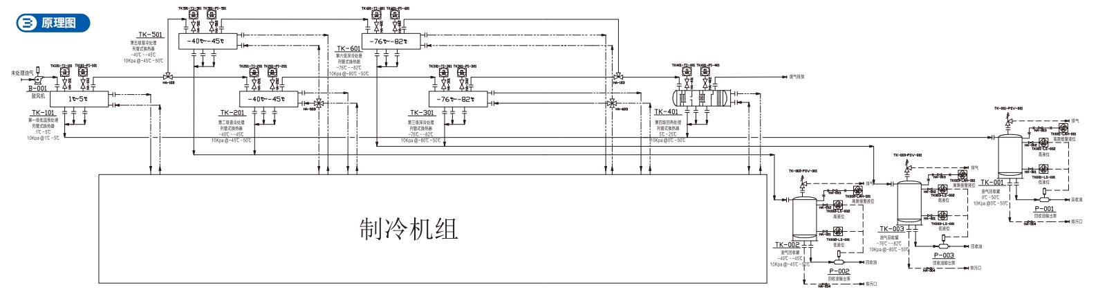 將揮發(fā)VOCs?體導(dǎo)?到設(shè)備冷箱(設(shè)置冷凝溫度 3℃? -40℃? -75℃? -115℃)可以定制其他溫度區(qū),根據(jù)需求進(jìn)?逐級冷凝液化。部分連續(xù)?產(chǎn)?藝在低溫段做雙路切換?藝(?側(cè)冰堵后,直接切換到另?路換熱冷箱冷凝,同時冰堵側(cè)做融霜處理)。